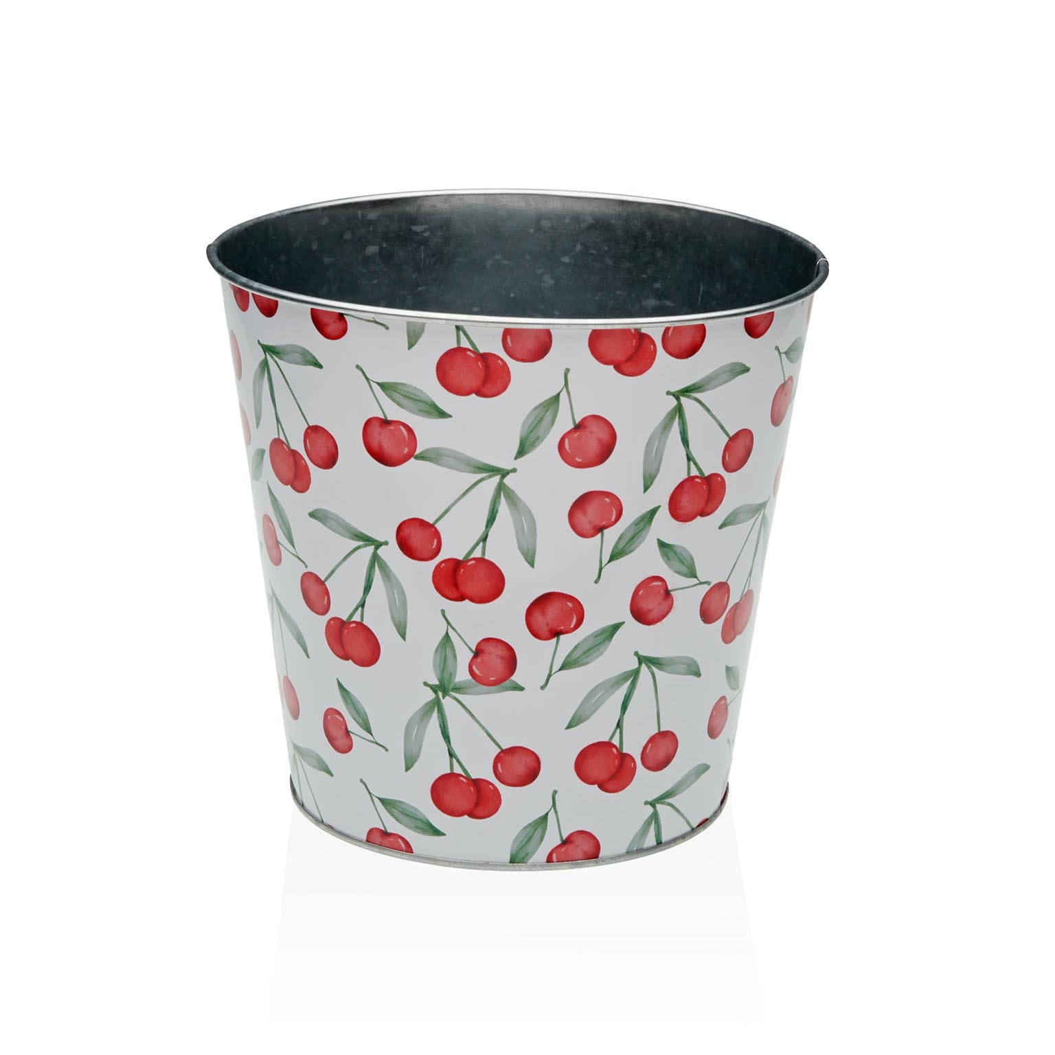 Com dimensões de 16,5 cm de altura, 17,5 cm de largura e 17,5 cm de comprimento, este vaso em metal apresenta uma base branca adornada com estampas vibrantes de cerejas vermelhas e folhas verdes.