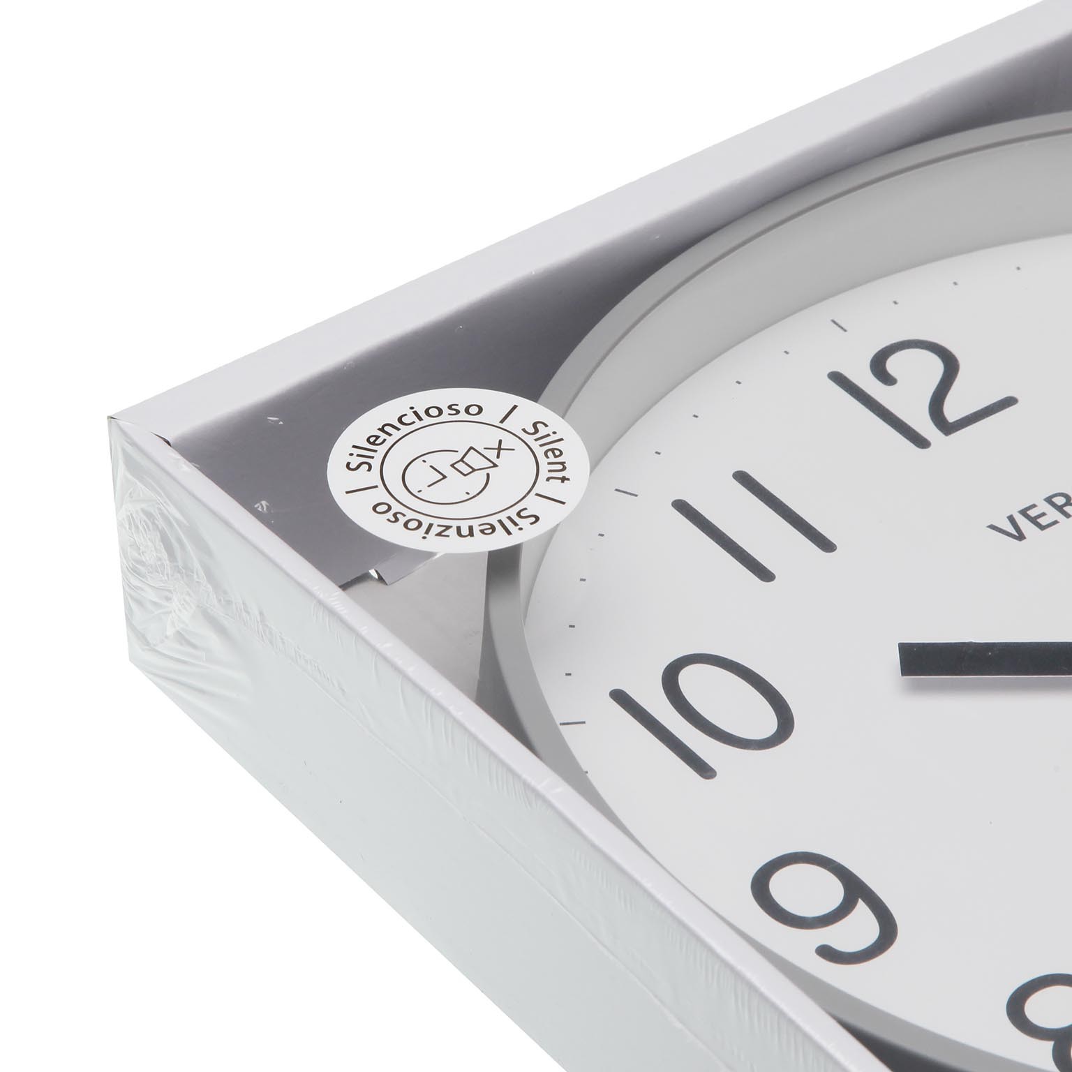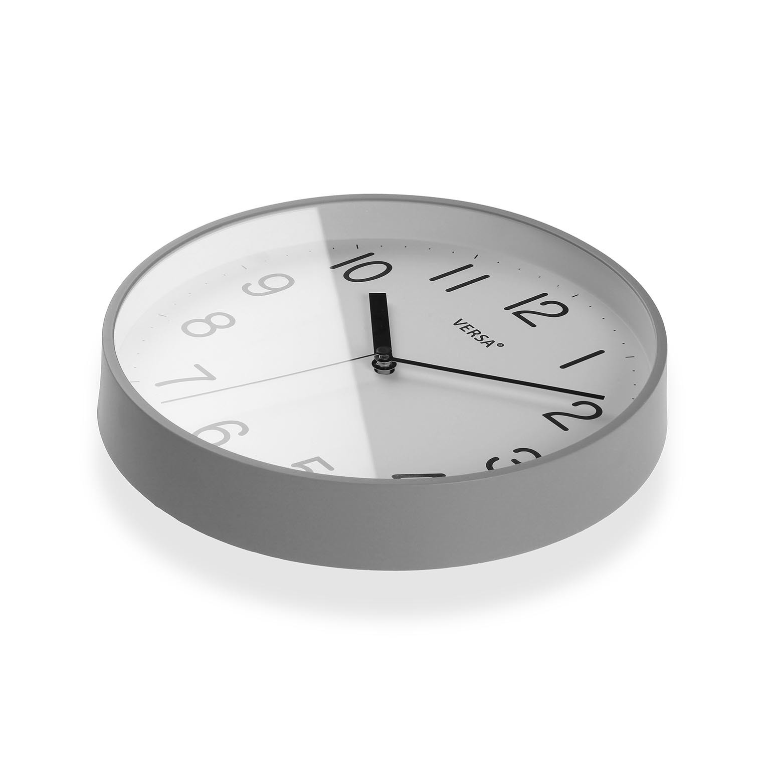 Relógio de parede cinza com 25 cm de diâmetro, fabricado em madeira MDF e plástico, combina funcionalidade e estilo moderno.