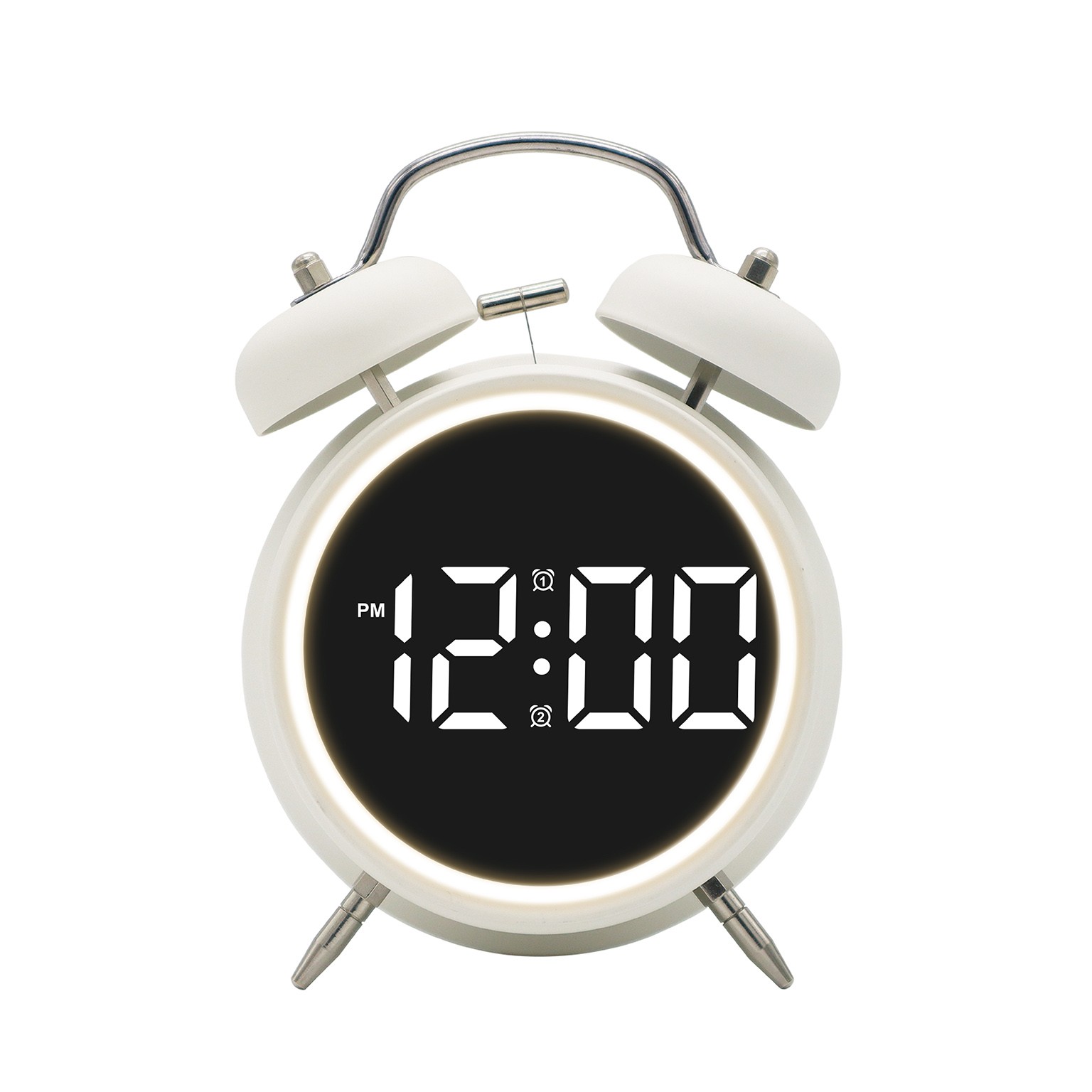 O display digital em preto contrasta elegantemente com o corpo branco, tornando-o uma peça versátil para quartos, mesas de cabeceira ou escritórios.