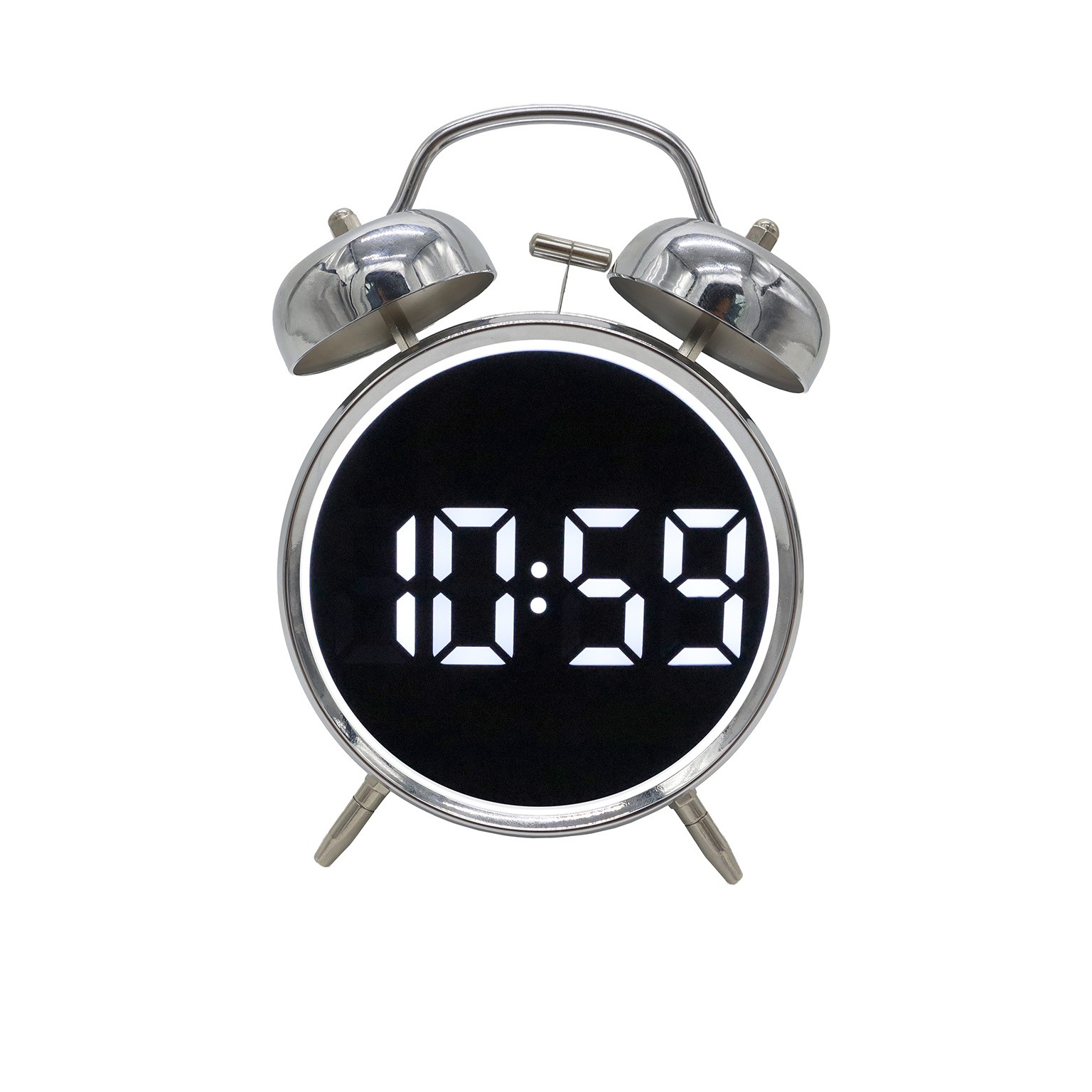 Despertador digital prateado com estrutura em metal, combina funcionalidade e estilo moderno.
