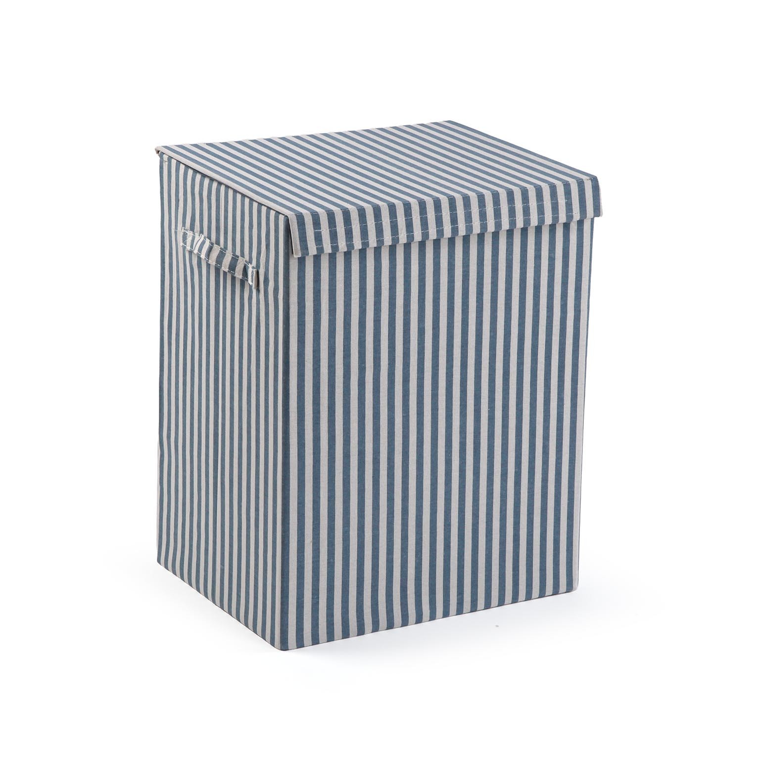 O cesto de roupa dobrável em riscas azul é uma solução prática e estilosa para a organização de roupas sujas.