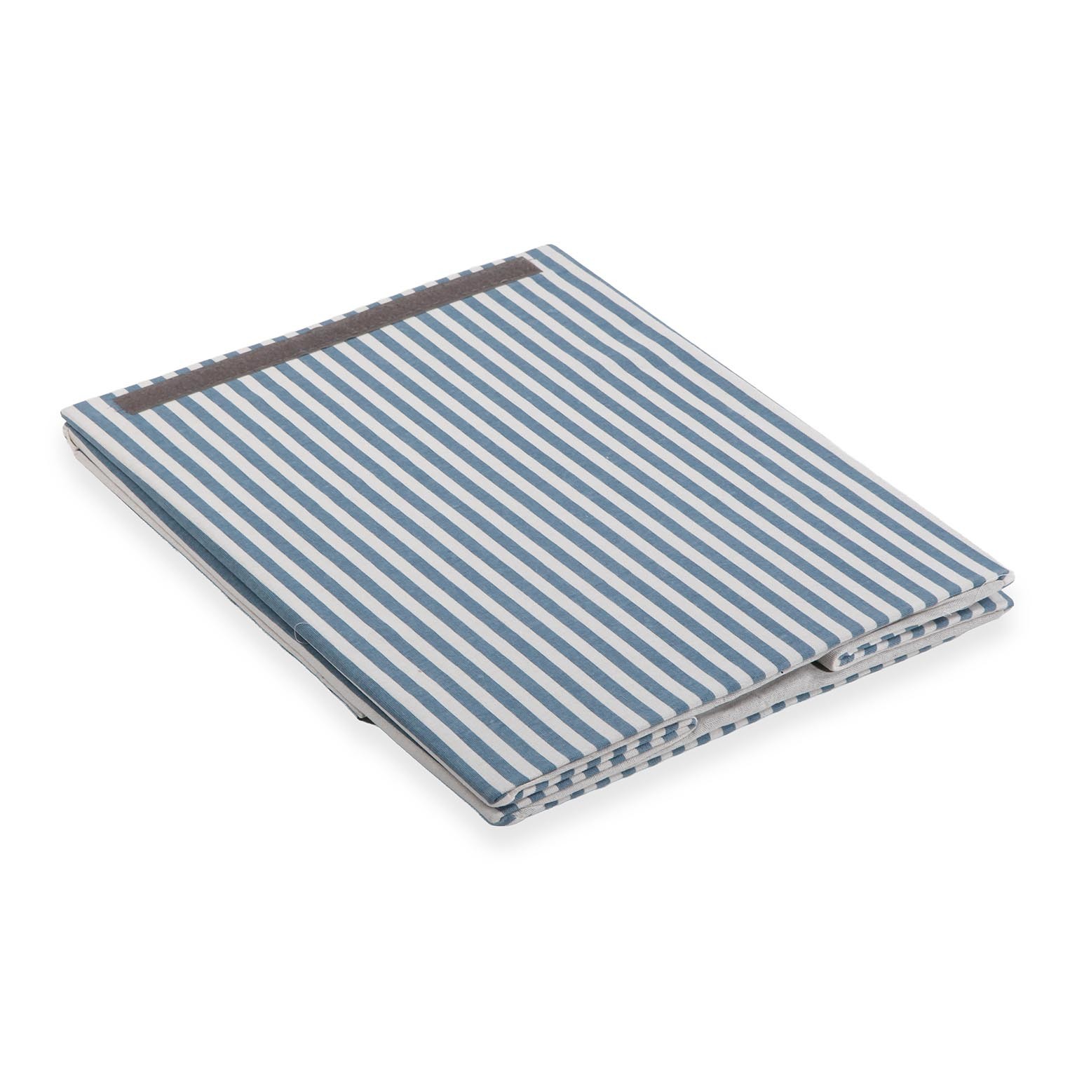 O padrão de riscas verticais em azul e branco confere um toque moderno e náutico, tornando-o ideal para a casa de banho, quartos ou áreas de serviço.