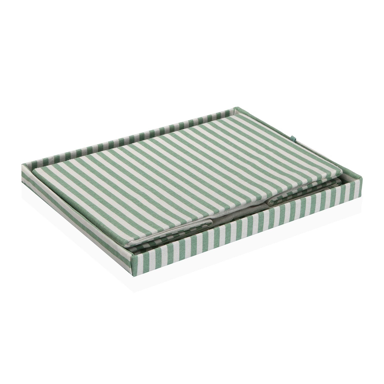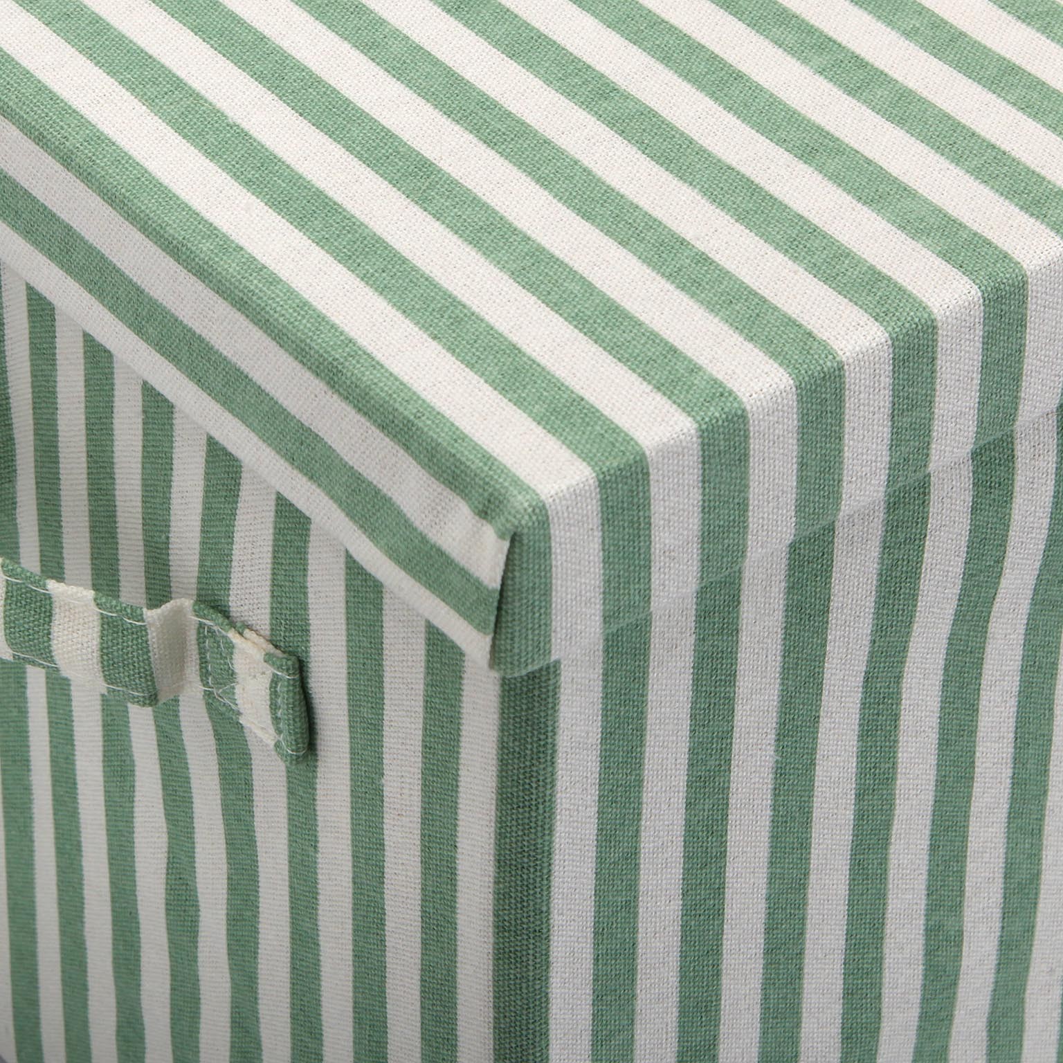 Cesta com tampa retangular em riscas verdes, ideal para o armazenamento de roupas na casa de banho ou em outros espaços do lar.