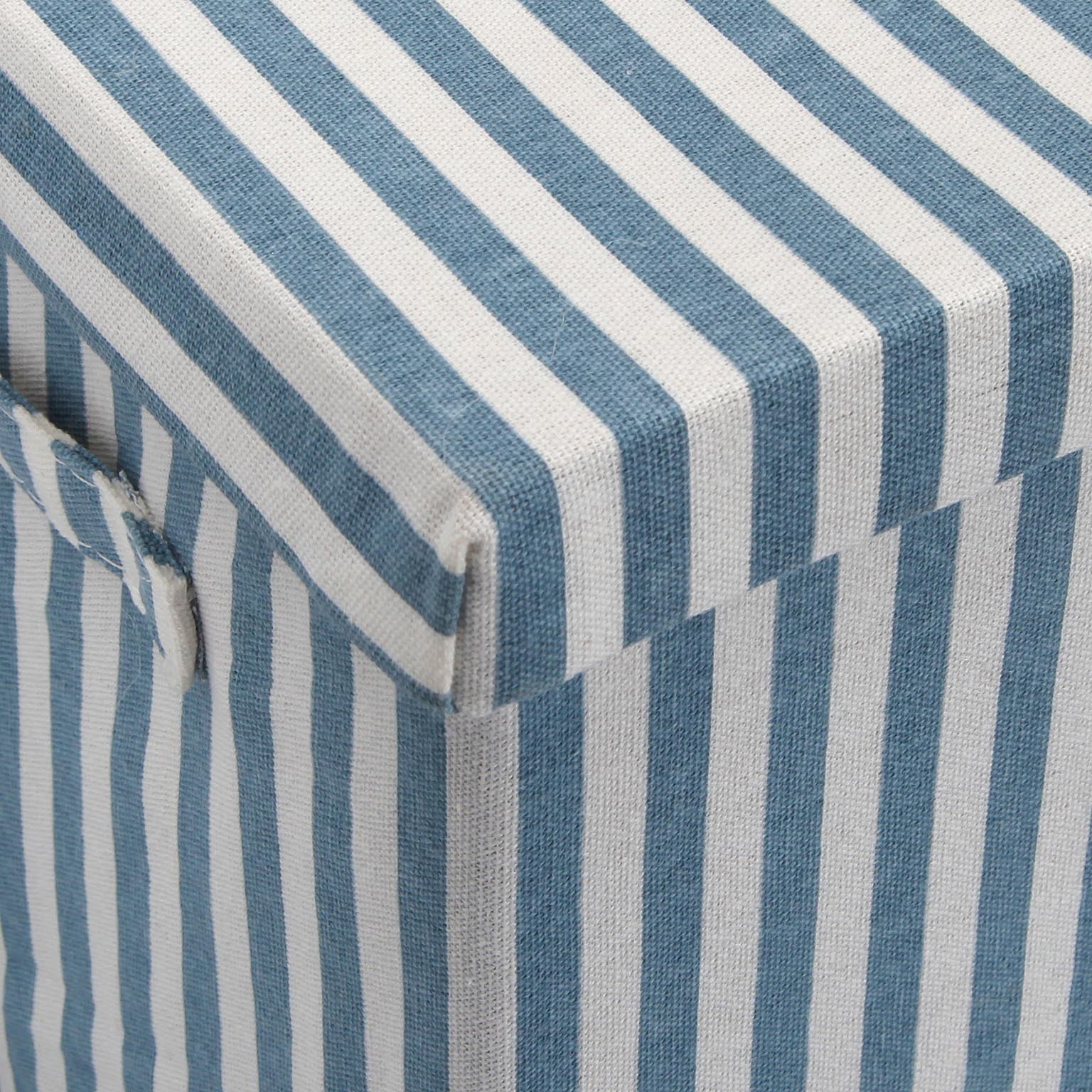 A cesta com tampa retangular em riscas azul é uma solução prática e estilosa para o armazenamento de roupas sujas ou outros itens.