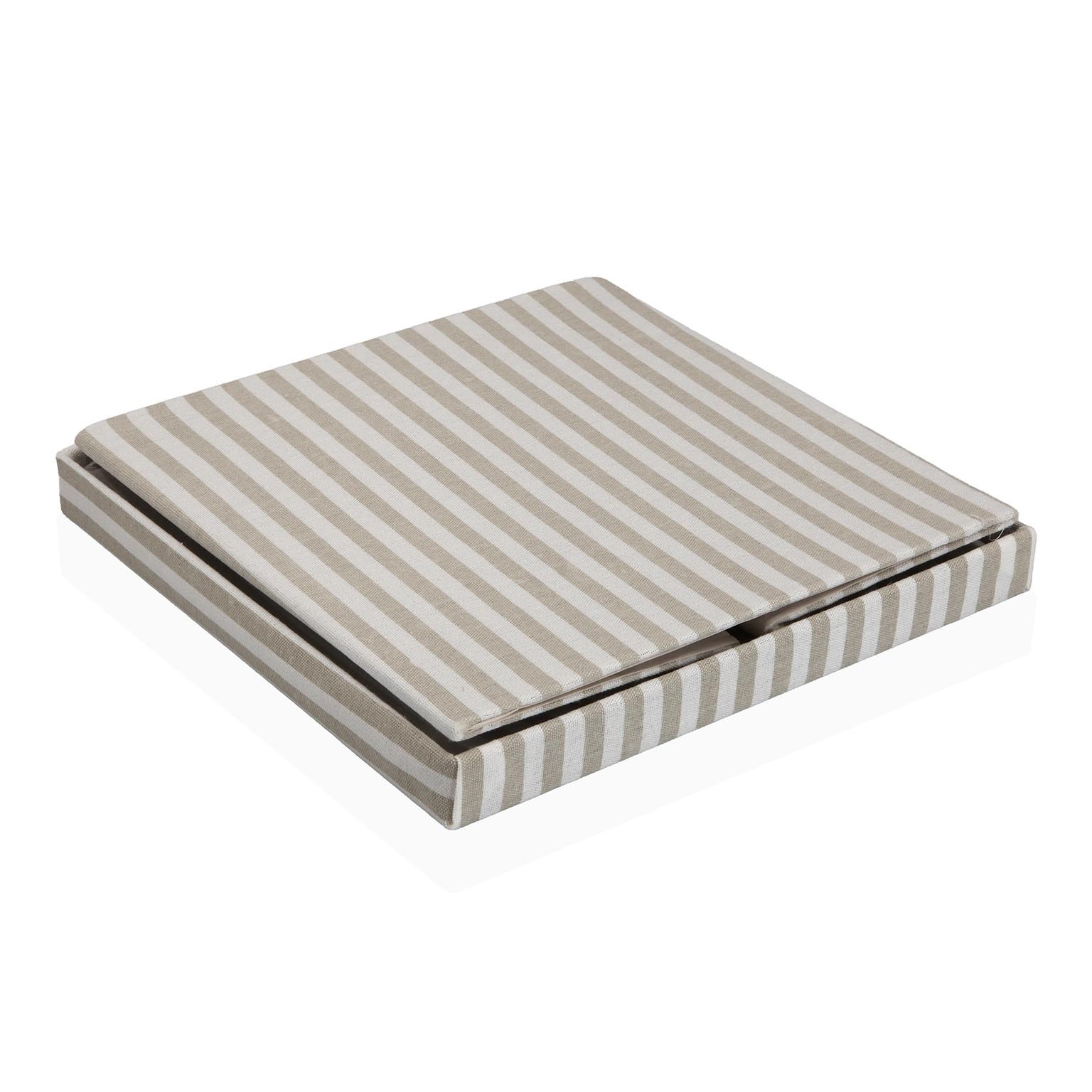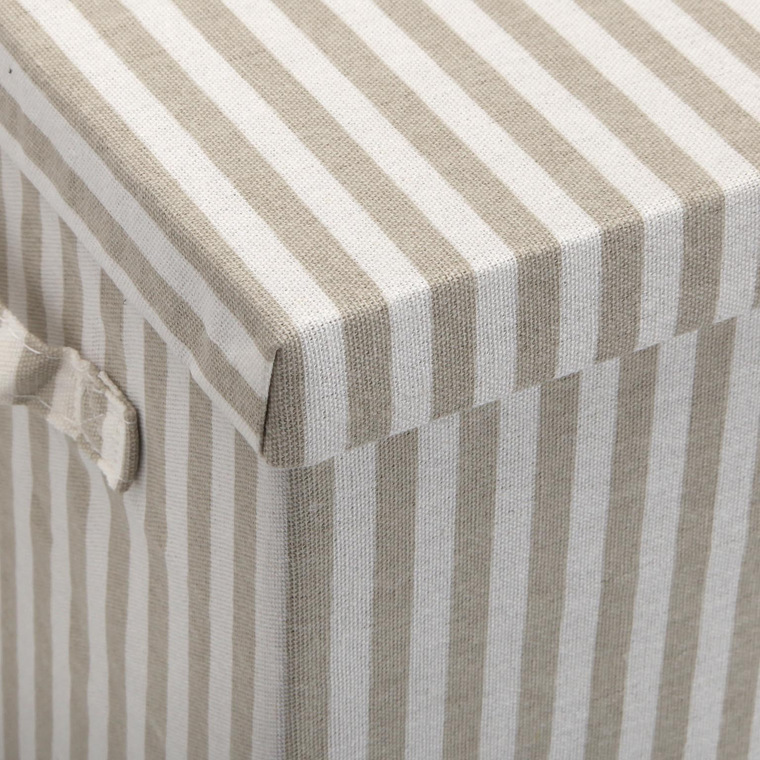 Cesta com tampa quadrada em riscas cinza, ideal para organização de roupas sujas ou outros itens.