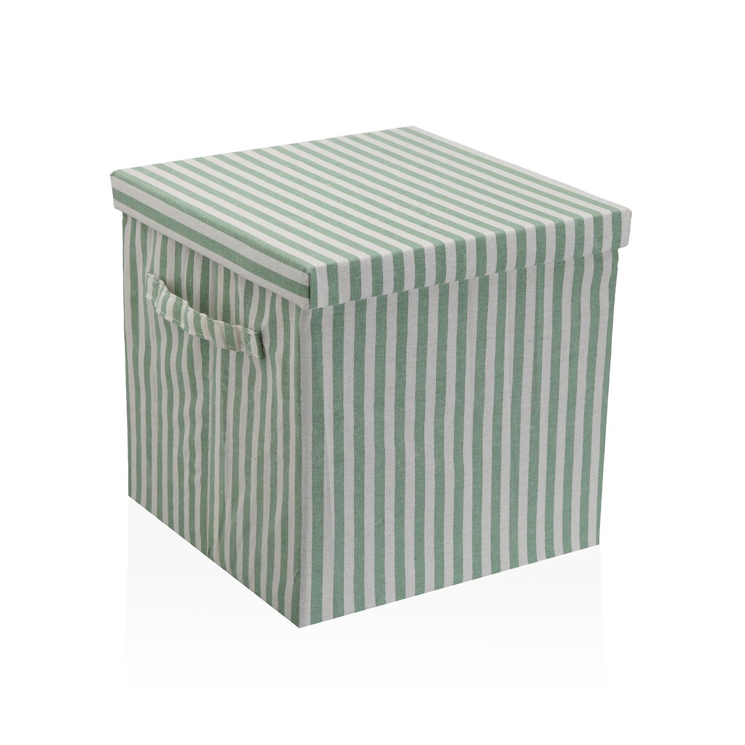 Cesta com tampa quadrada em riscas verdes, ideal para o armazenamento e organização de roupas sujas ou pequenos itens.