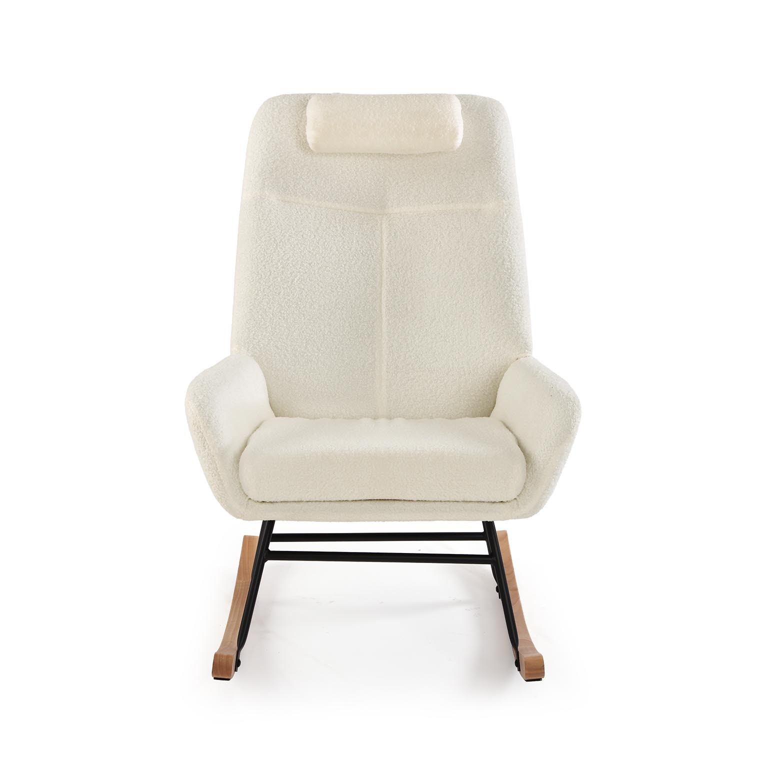 A cadeira de baloiço almofadada em bege é uma peça versátil que combina conforto e estilo moderno.