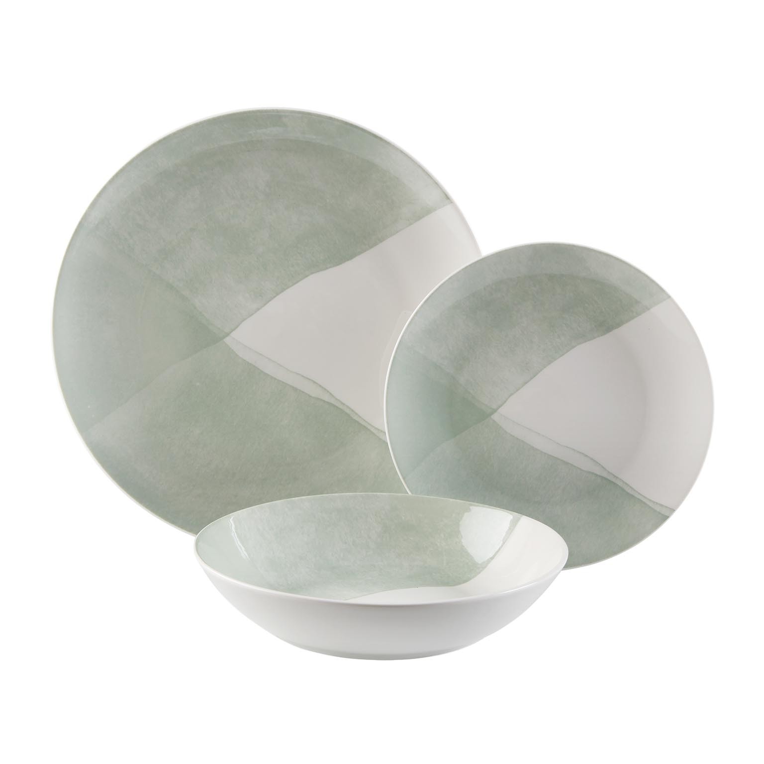 Composto por 6 pratos planos de 26,5 cm, 6 pratos fundos de 20 cm e 6 pratos de sobremesa de 19 cm, este conjunto em porcelana apresenta um design moderno e minimalista, com um suave tom de verde.
