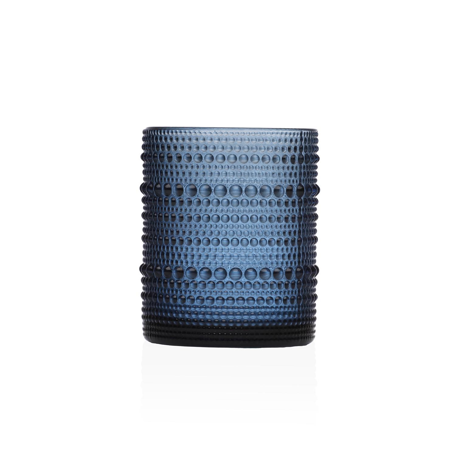 Com dimensões de 10 cm de altura, 8 cm de largura e 8 cm de comprimento, este copo em vidro apresenta uma textura que evoca um acabamento artesanal.