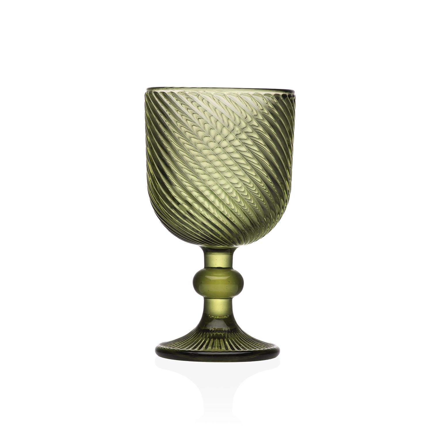 Copo de vinho pequeno verde, confeccionado em vidro com um elegante acabamento texturizado.