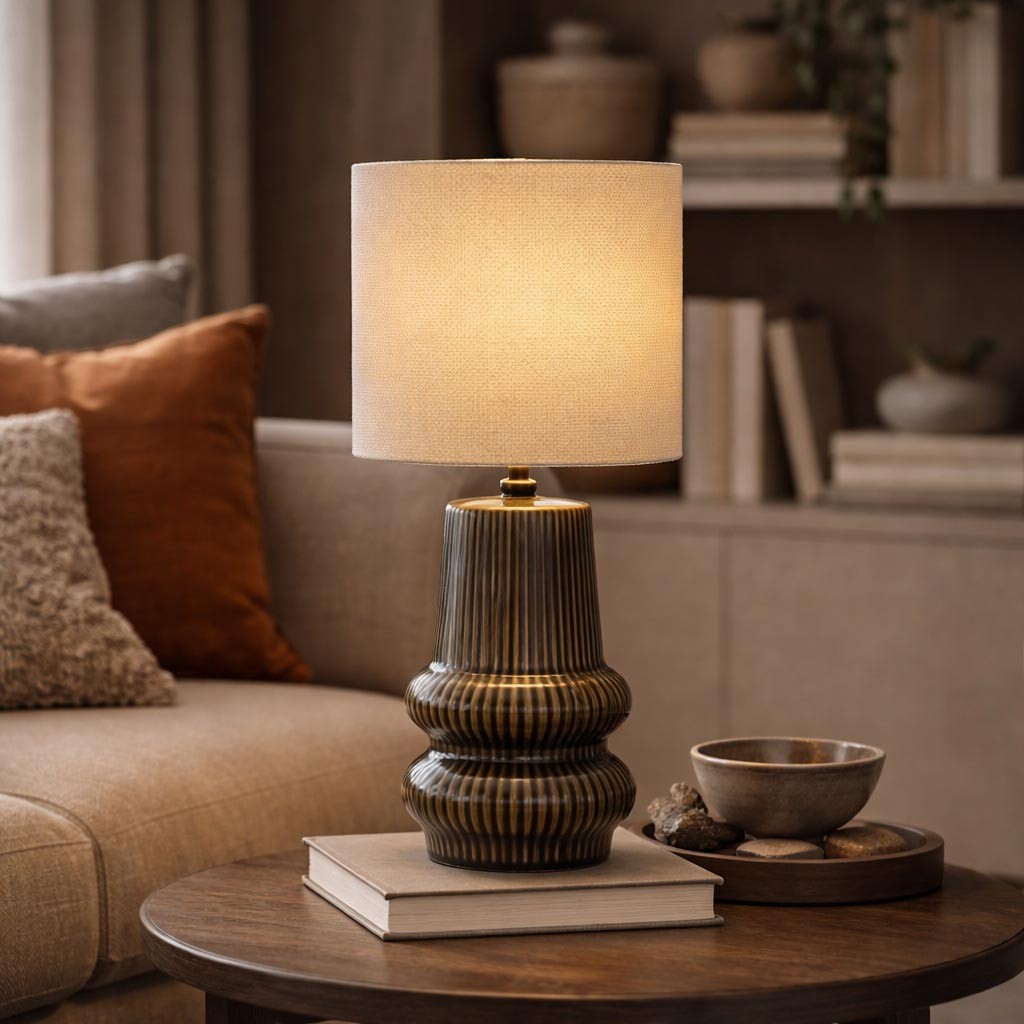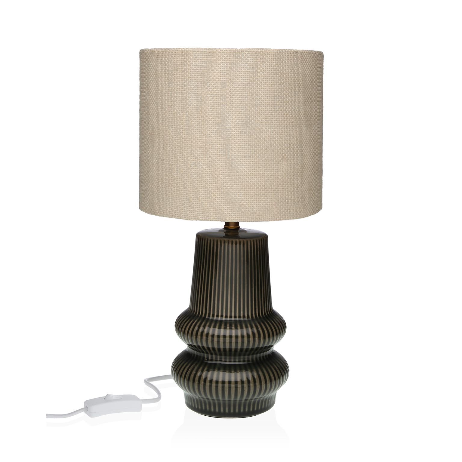 Com uma base em cerâmica verde e um abajur em linho bege, apresenta um design moderno com linhas orgânicas.