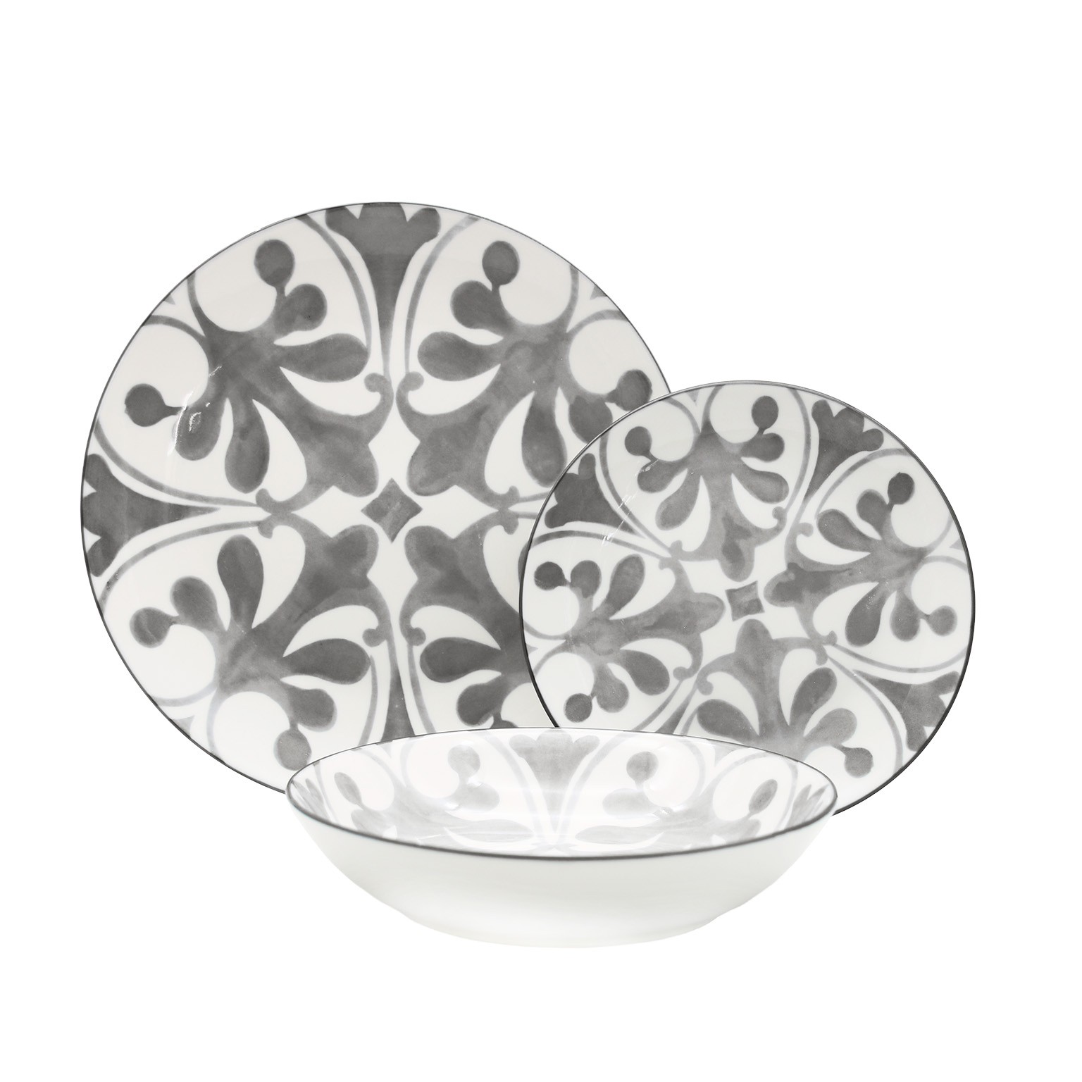 O serviço de mesa Vajilla 18 Piezas Laila Gris é composto por 18 peças em porcelana, incluindo 6 pratos planos de 26,5 cm, 6 pratos fundos de 23 cm e 6 pratos de sobremesa de 19 cm.
