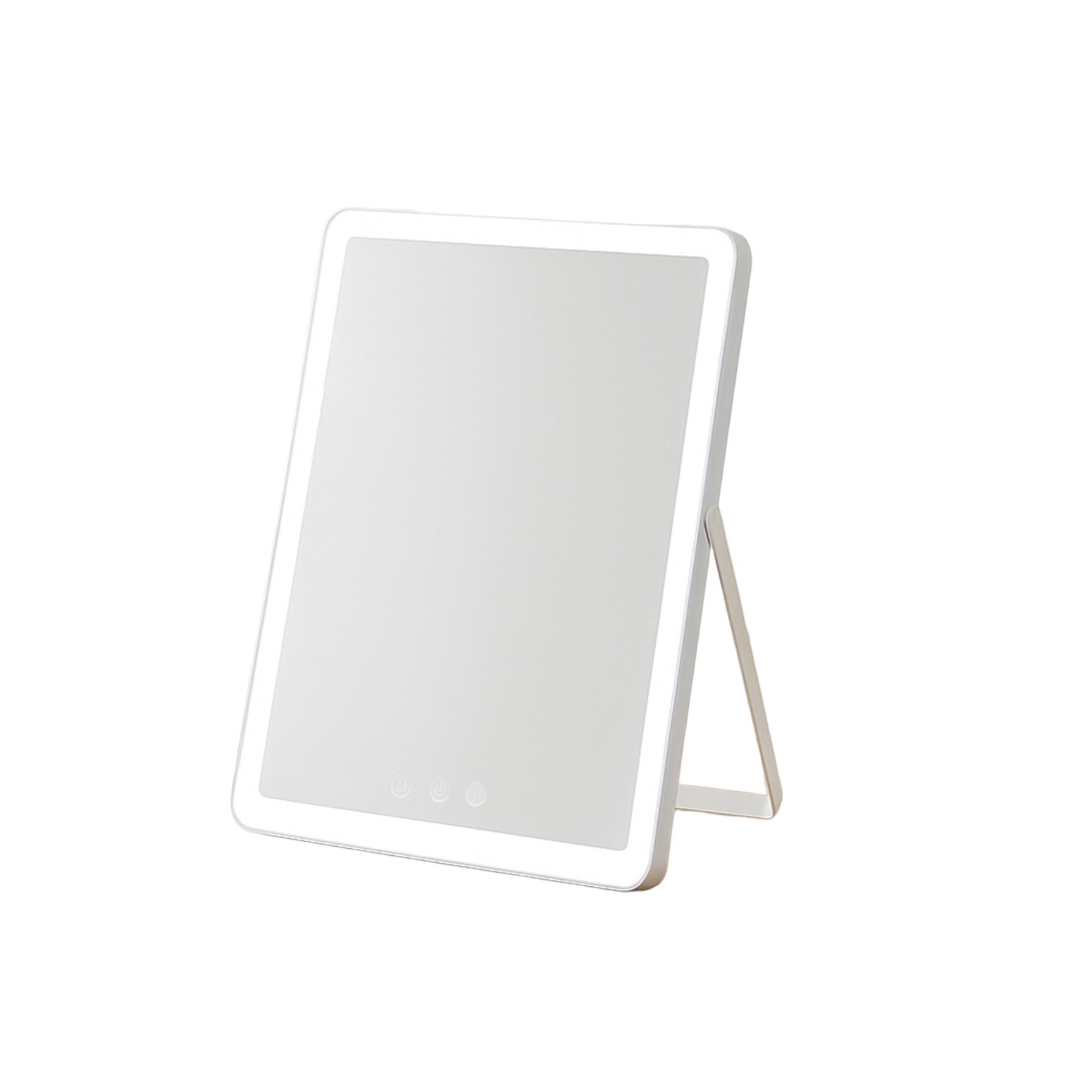 Espelho retangular com 9 LEDs e suporte, ideal para complementar a decoração em diversos espaços do lar.