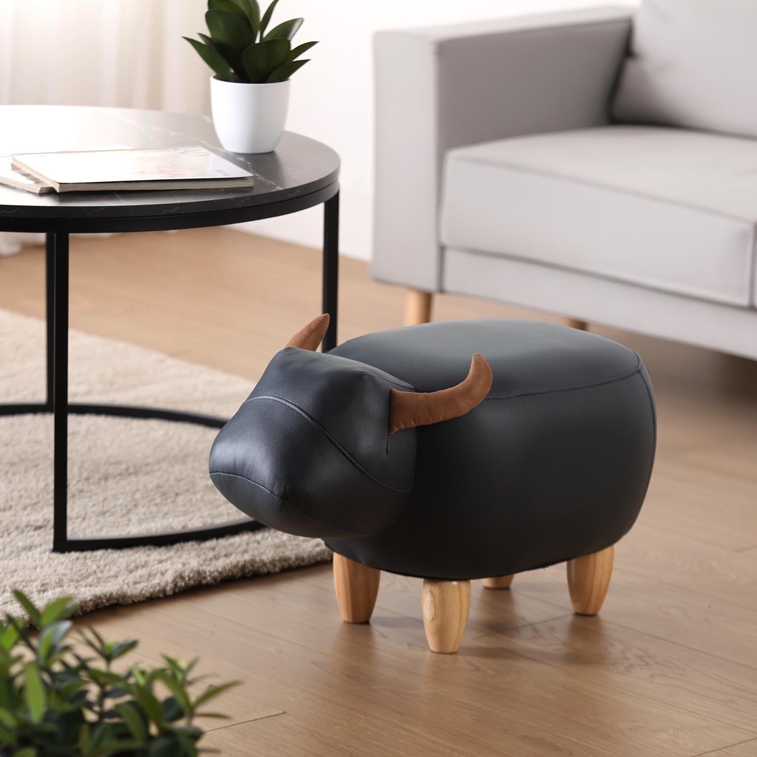 O pufe touro preto é um móvel auxiliar versátil que combina funcionalidade e estilo moderno.